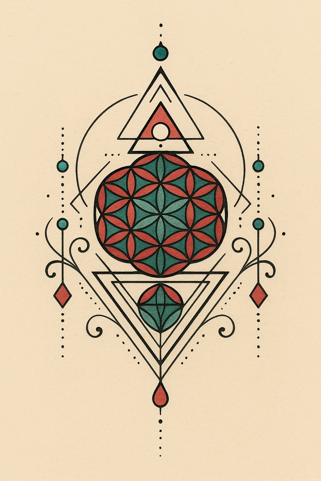 /Collection: /by davooda/Type: PNG/This image features a geometric design incorporating floral patterns and shapes. It uses a minimalistic color palette with red, green, and black elements, ideal for art prints or spiritual themes.