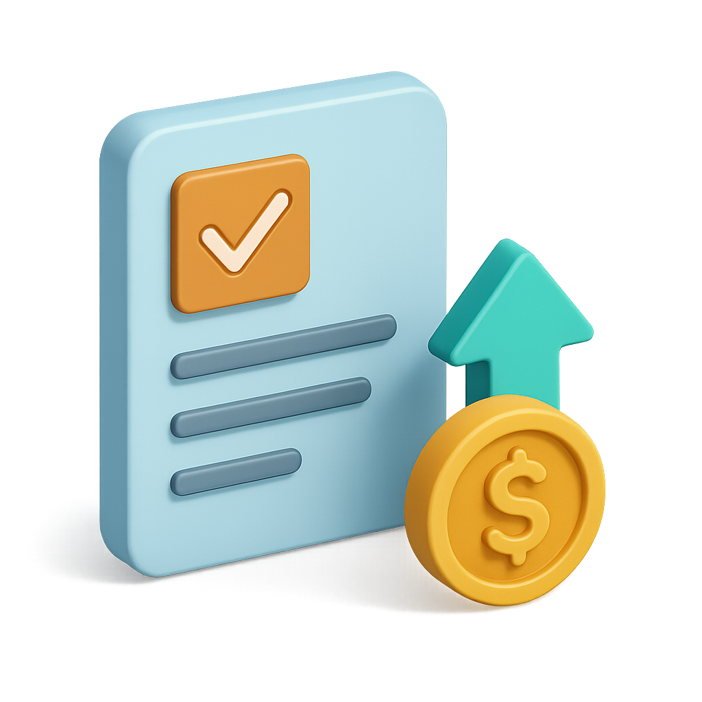 /Collection: /by davooda/Type: PNG/A visually appealing 3D limit-order icon featuring a checkmark on a document, an upward arrow, and a dollar sign coin, all rendered in a vibrant color palette with a transparent background.