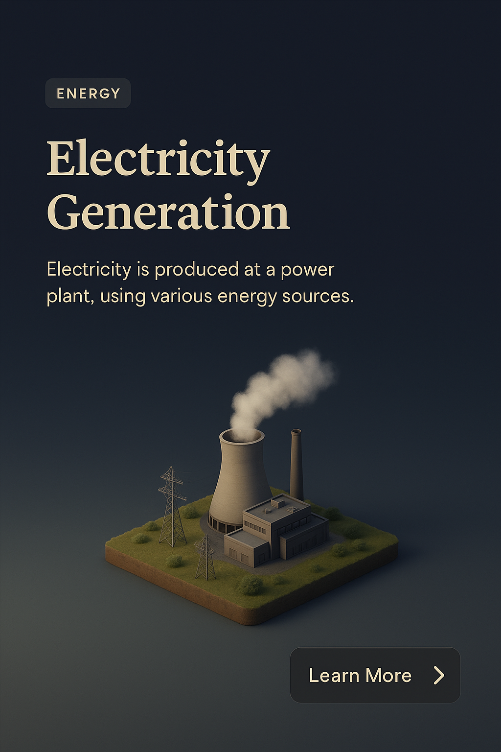 /Collection: /by davooda/Type: PNG/A detailed 3D scene depicting a power plant with smokestacks, showcasing electricity generation. The design features a dark gradient background and cohesive text elements.