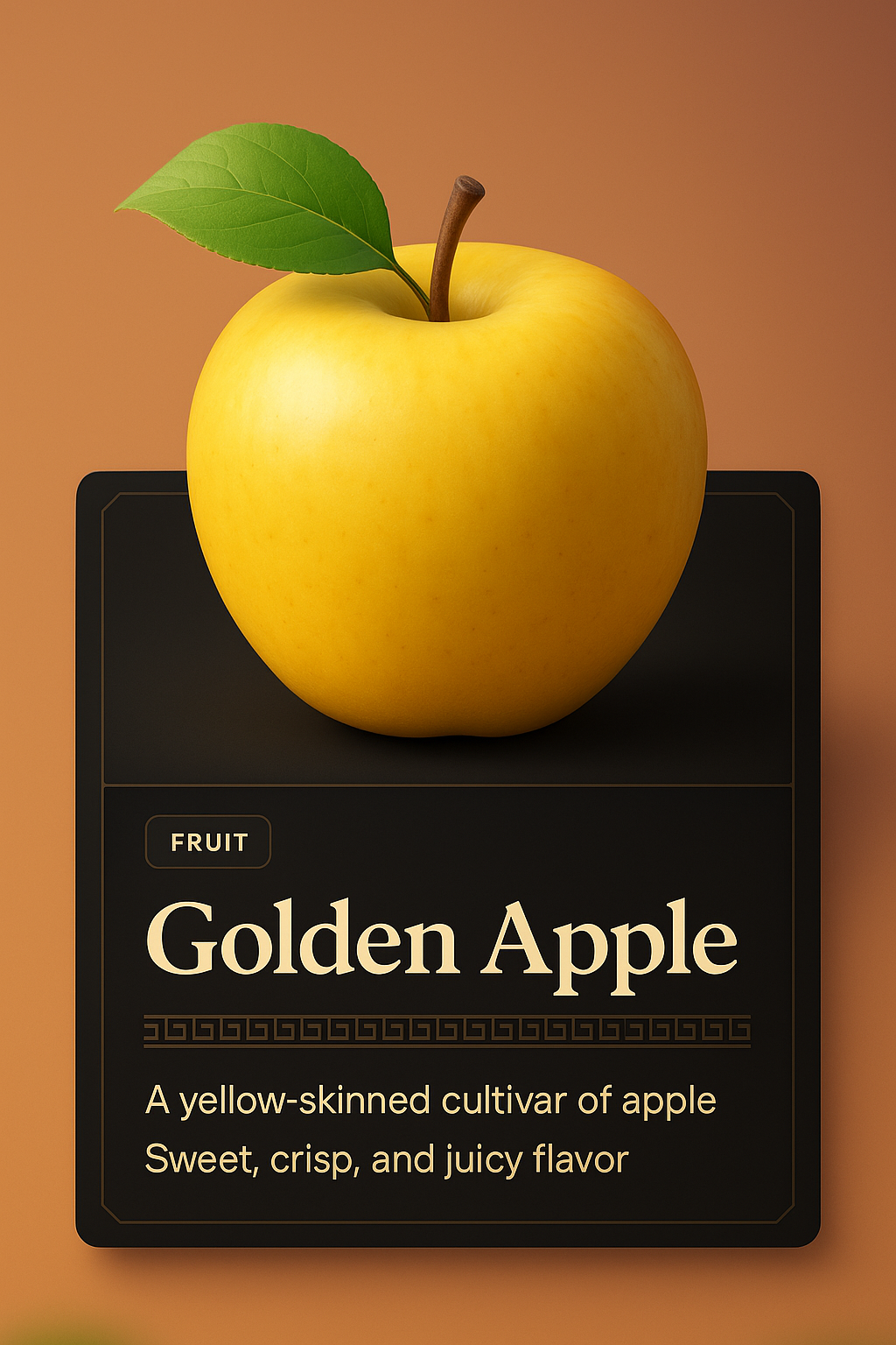 A stunning 3D illustration of a golden apple, set against a smooth gradient background. It features a dark overlay with a stylish label detailing its sweet and juicy flavor.