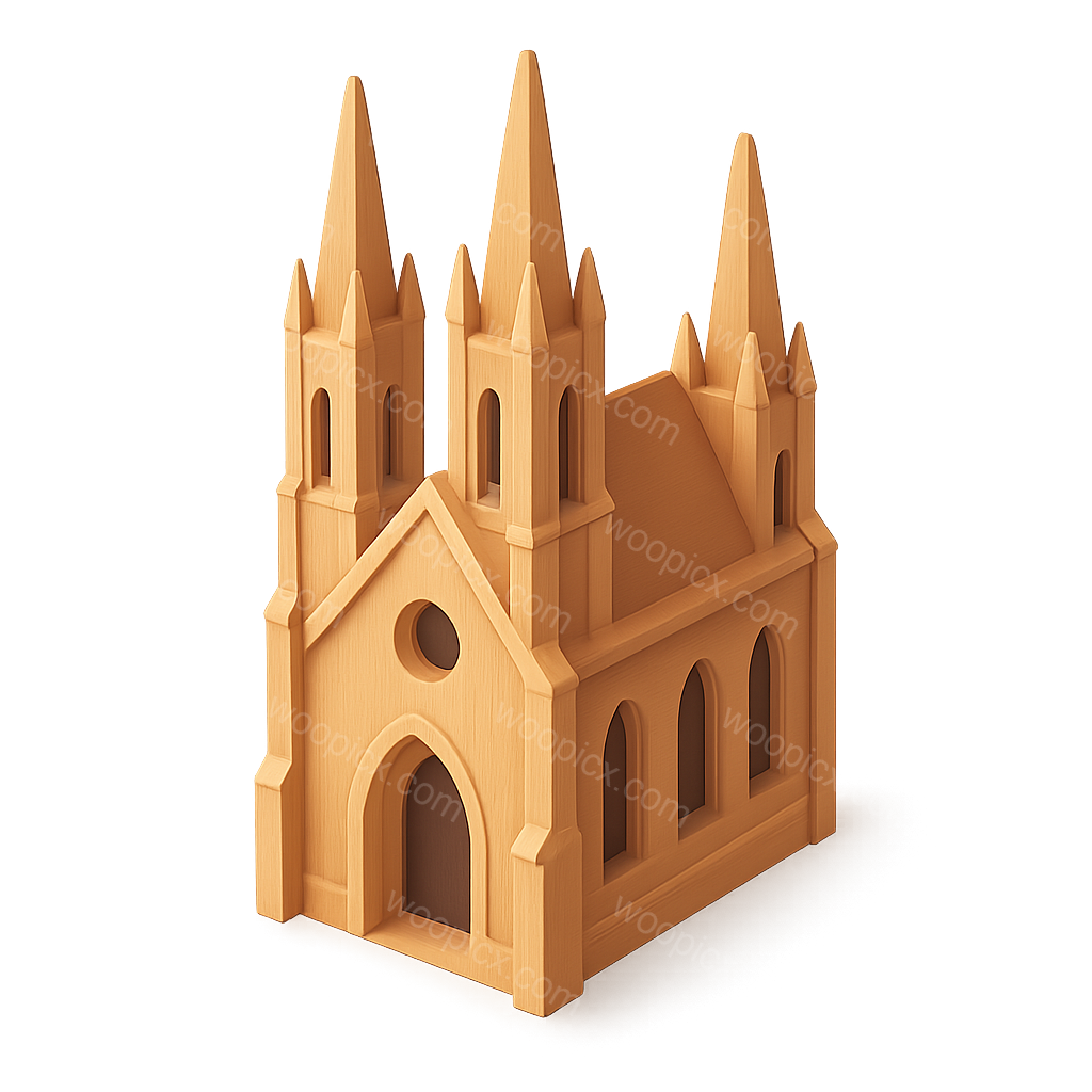 /Premium/Collection: /by davooda/Type: PNG/A 3D representation of a gothic cathedral with tall spires, crafted from a wooden texture. The design features a three-quarter view, emphasizing its isometric and volumetric qualities against a soft gradient background.