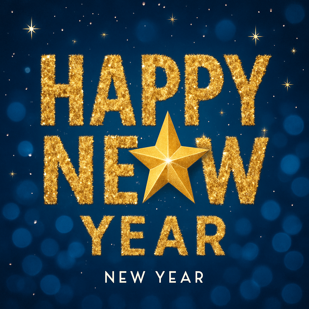 Vibrant New Year themed graphic featuring glittery text and a star, ideal for celebratory posts and greetings. The blue backdrop enhances the festive mood.