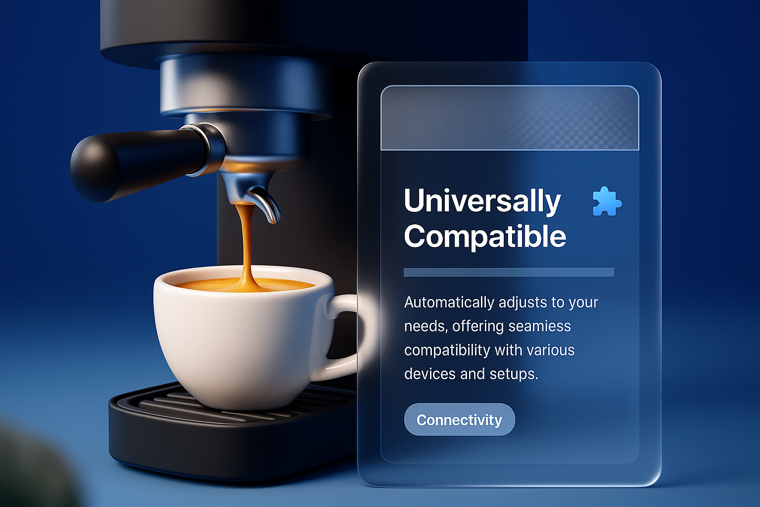 A 3D coffee machine pouring coffee into a white cup, accompanied by a transparent feature block highlighting compatibility and connectivity. The background features a smooth gradient.