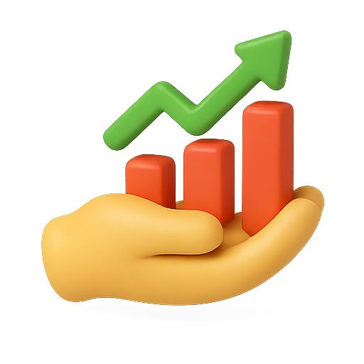 A 3D representation of a hand holding a bar graph with an upward trend arrow, symbolizing growth and progress. This graphic is ideal for financial, business, or marketing contexts.