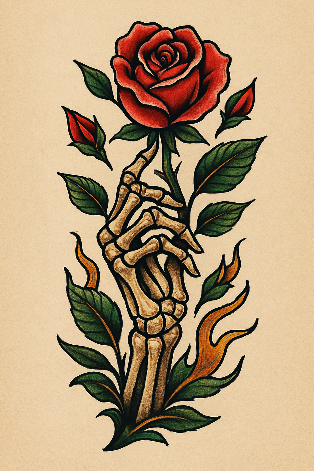 /Collection: /by davooda/Type: PNG/This image features a tattoo-style graphic of a skeletal hand holding a vibrant red rose surrounded by green leaves. It combines elements of nature and mortality, ideal for tattoo designs or art prints.