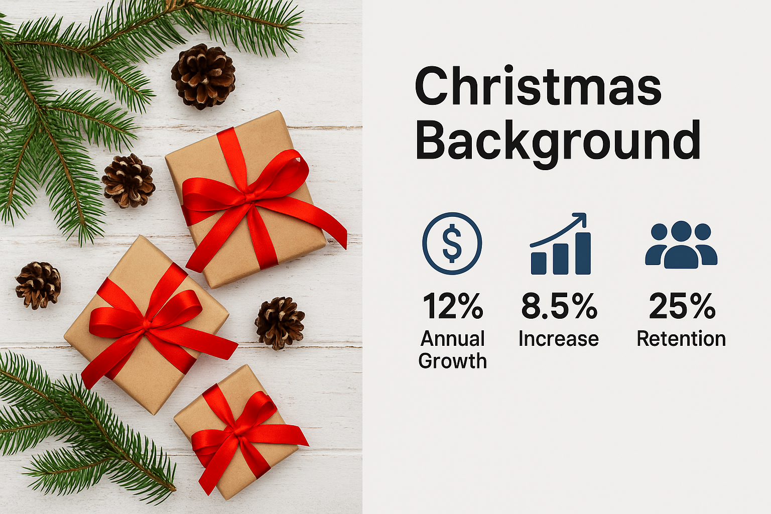 Infographic featuring festive elements like gift boxes and pinecones alongside business growth statistics, ideal for seasonal marketing presentations.