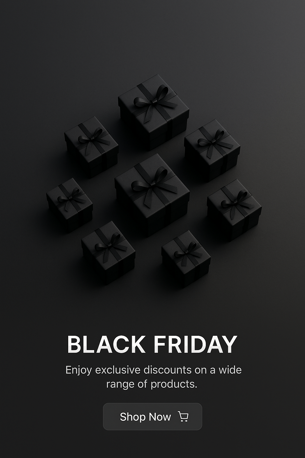 /Collection: /by davooda/Type: PNG/A visually striking arrangement of black gift boxes on a dark background, emphasizing a Black Friday discount theme. The 3D scene captures a sense of depth and realism.