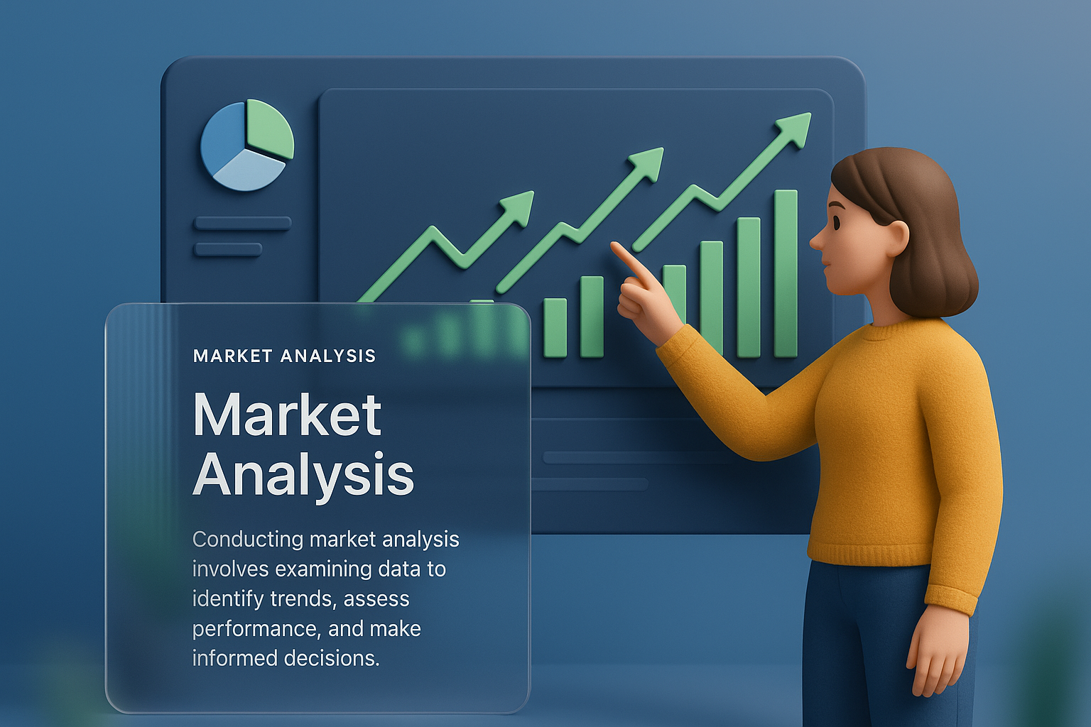 /Collection: /by davooda/Type: PNG/A woman points at a large display featuring market analysis graphs with upward trends and green arrows. The design includes a transparent block for text and additional graphics.