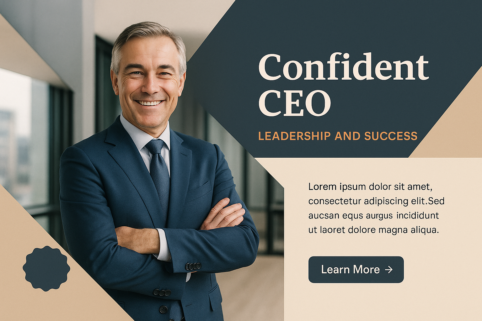 /Collection: /by davooda/Type: PNG/A middle-aged CEO stands confidently in a stylish office, arms crossed and smiling. He wears a blue suit, exuding professionalism and leadership. The composition features a layered design with geometric elements and a clear call to action.