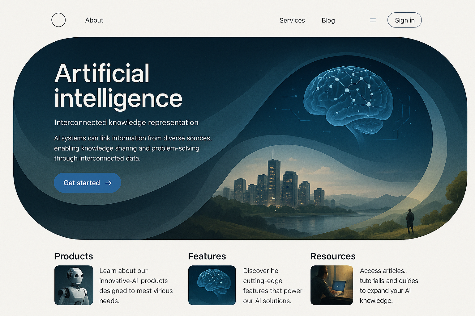 A visually engaging landing page showcasing artificial intelligence concepts. Features include a sign-in button, logo, and sections for products, features, and resources.