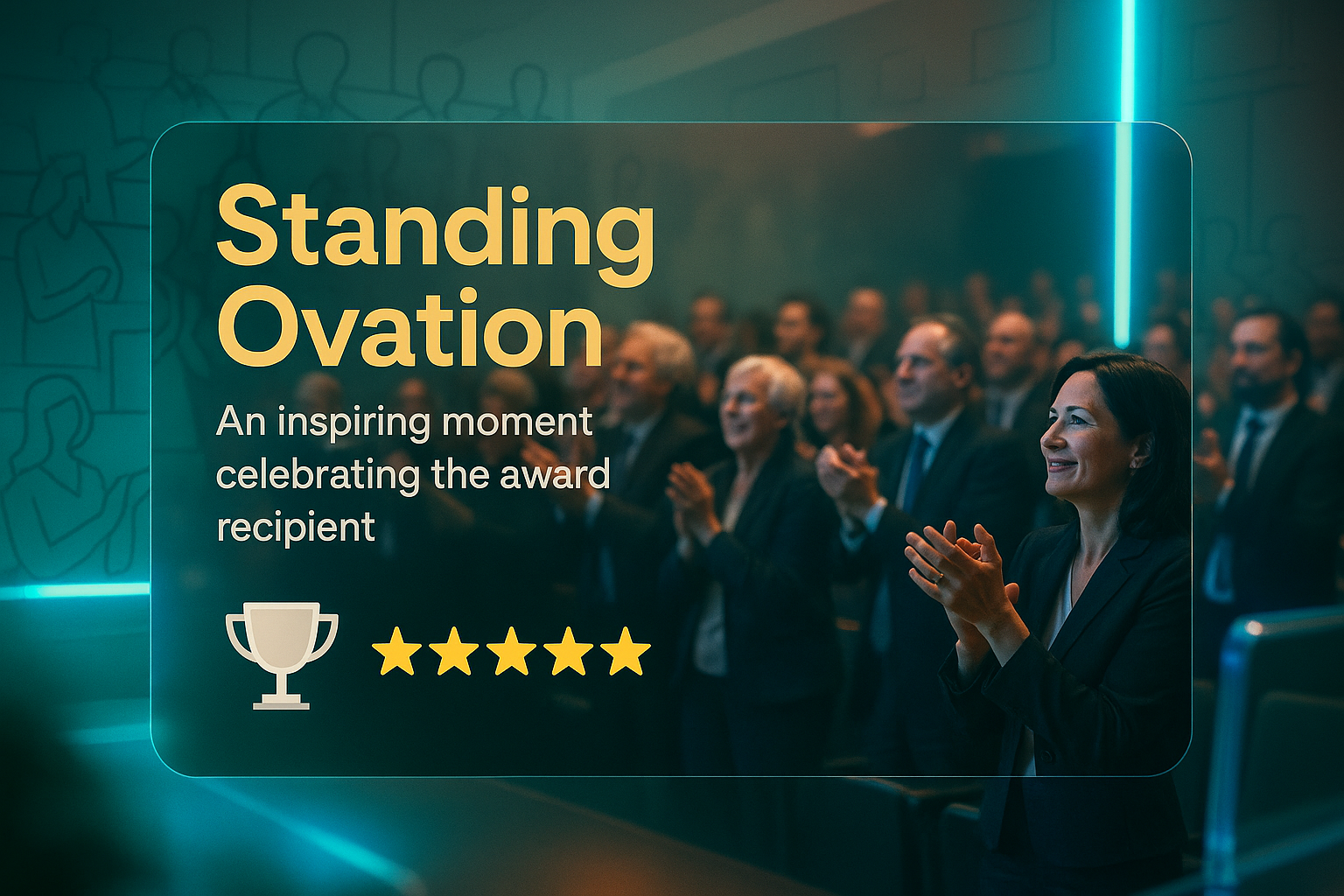 Dynamic image capturing an audience giving a standing ovation, showcasing an inspiring atmosphere at an award ceremony. Ideal for event promotion and recognition.