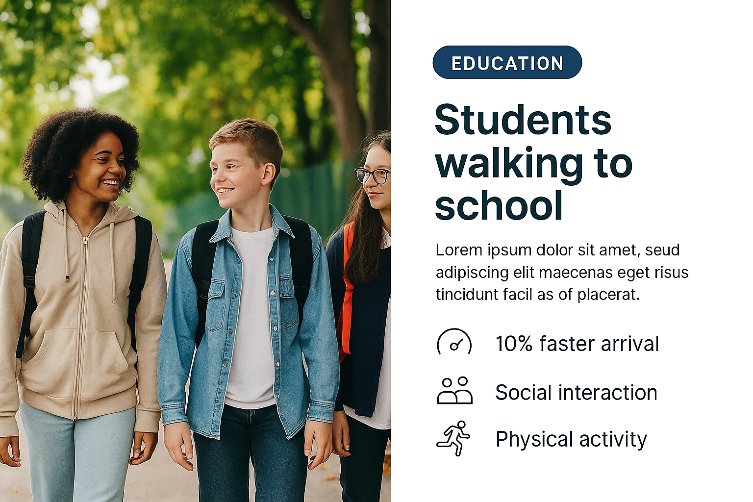 /Collection: /by davooda/Type: PNG/An engaging educational graphic showcasing students walking to school, highlighting benefits such as faster arrival and social interaction, ideal for school-related promotions.