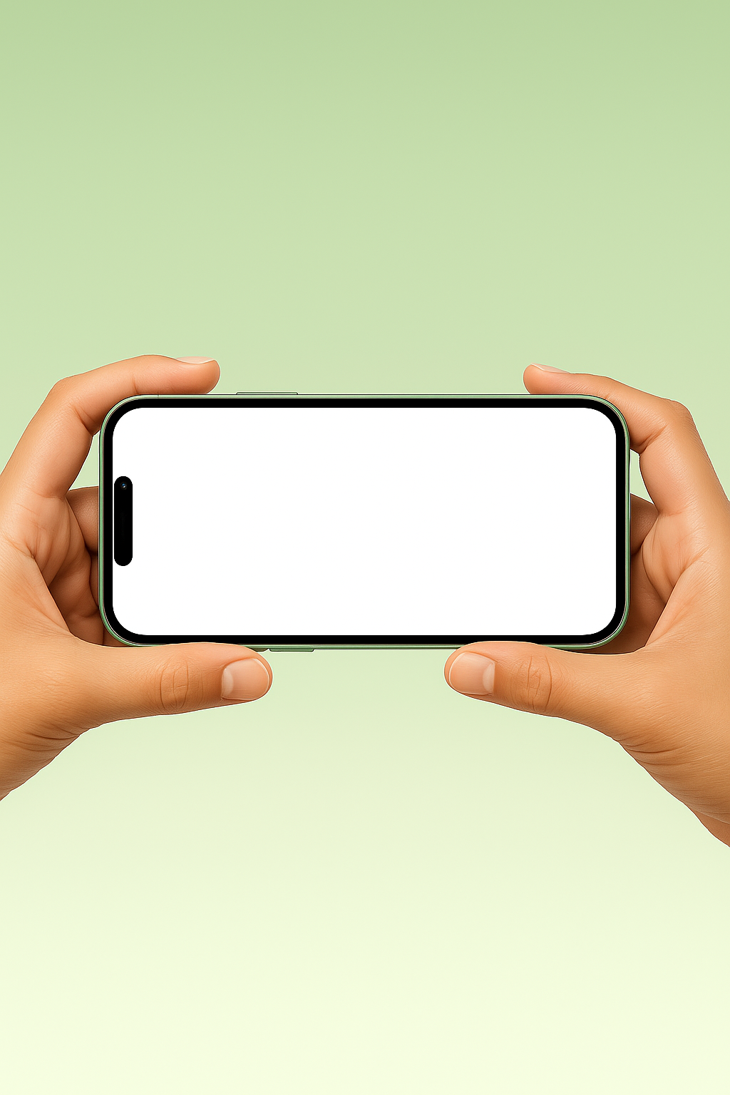 A green smartphone is held horizontally between two hands, positioned as if for gaming. The screen is blank and white, set against a soft gradient background.