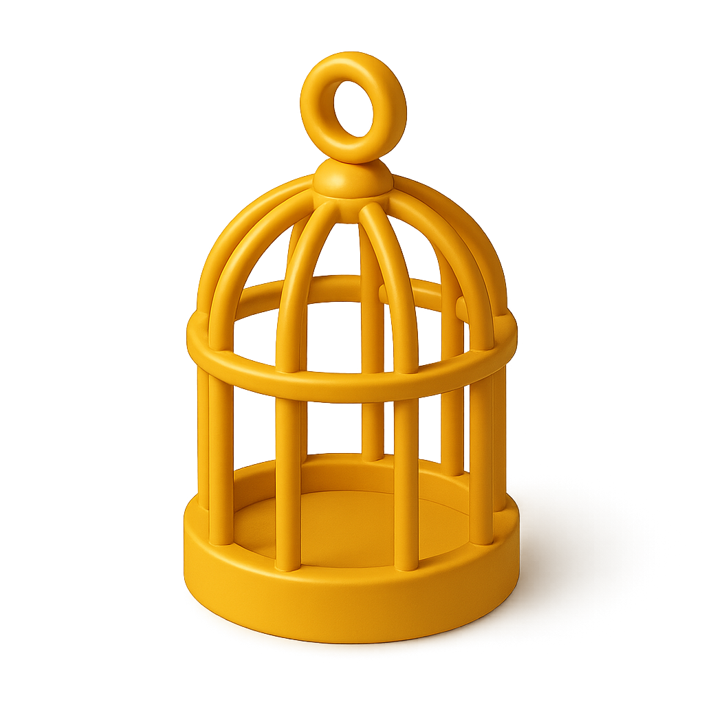 /Collection: /by davooda/Type: PNG/A visually appealing 3D icon of a yellow bird cage, rendered in a three-quarter isometric view. The design features smooth curves and a volumetric appearance against a subtle gradient background.