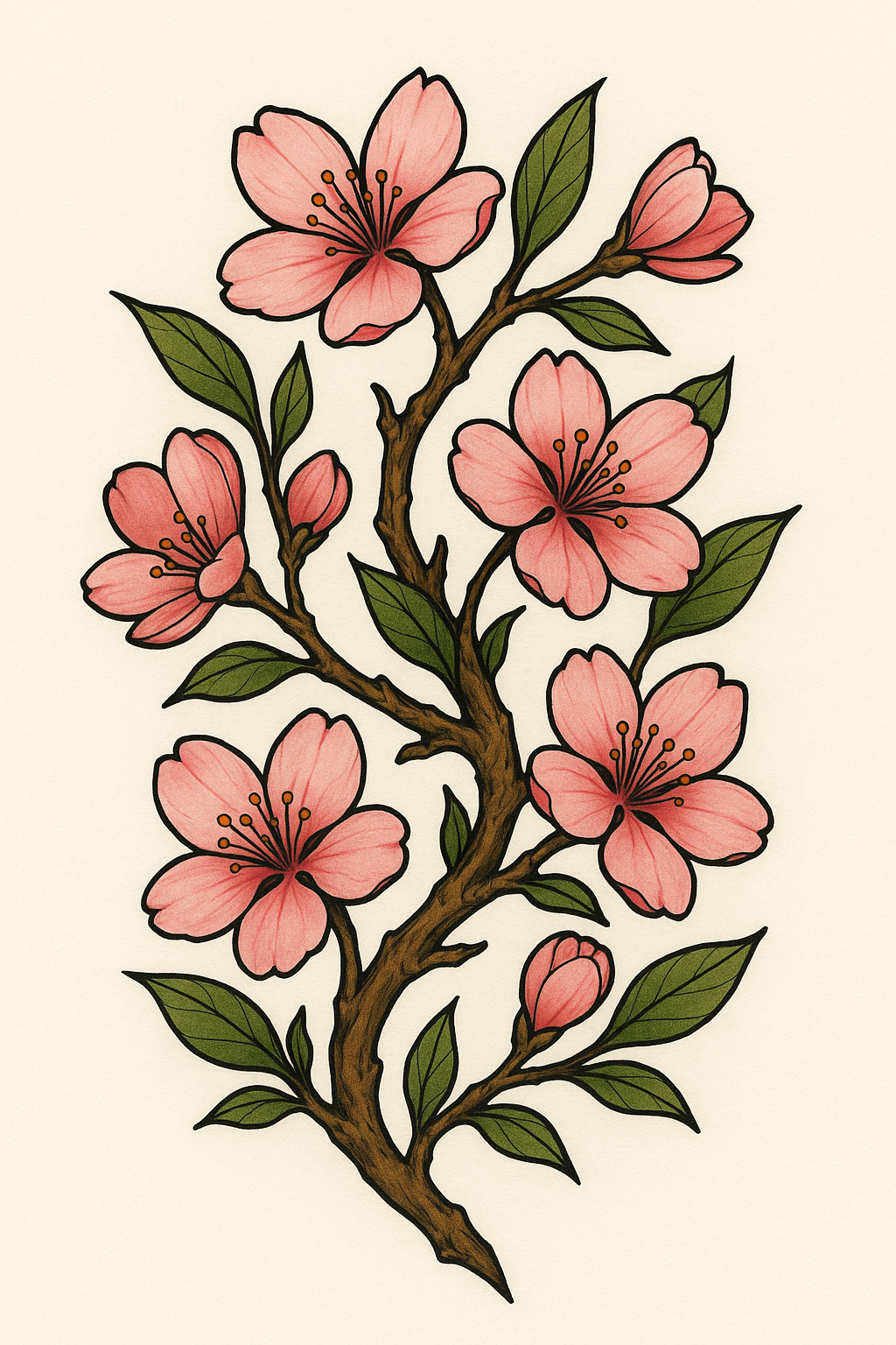 Illustration of Cherry Blossom Branch with Pink Flowers