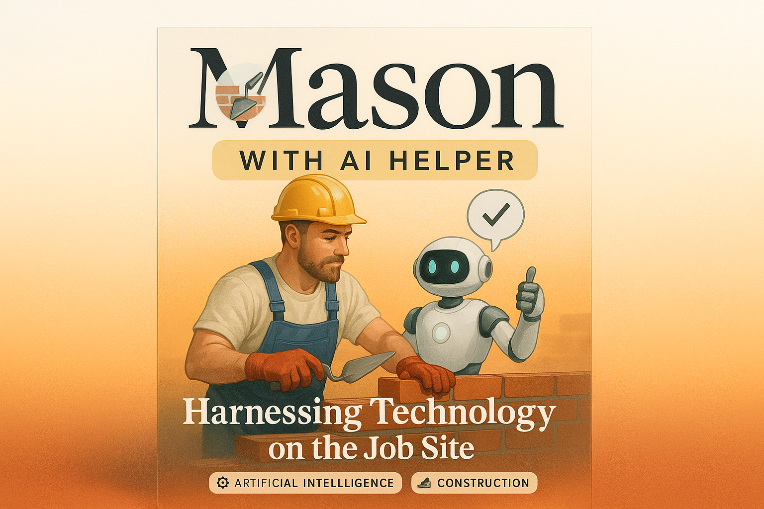 /Collection: /by davooda/Type: PNG/An illustration featuring a mason in a yellow hard hat working alongside a friendly AI robot, set against a warm gradient background. The design emphasizes collaboration in construction.