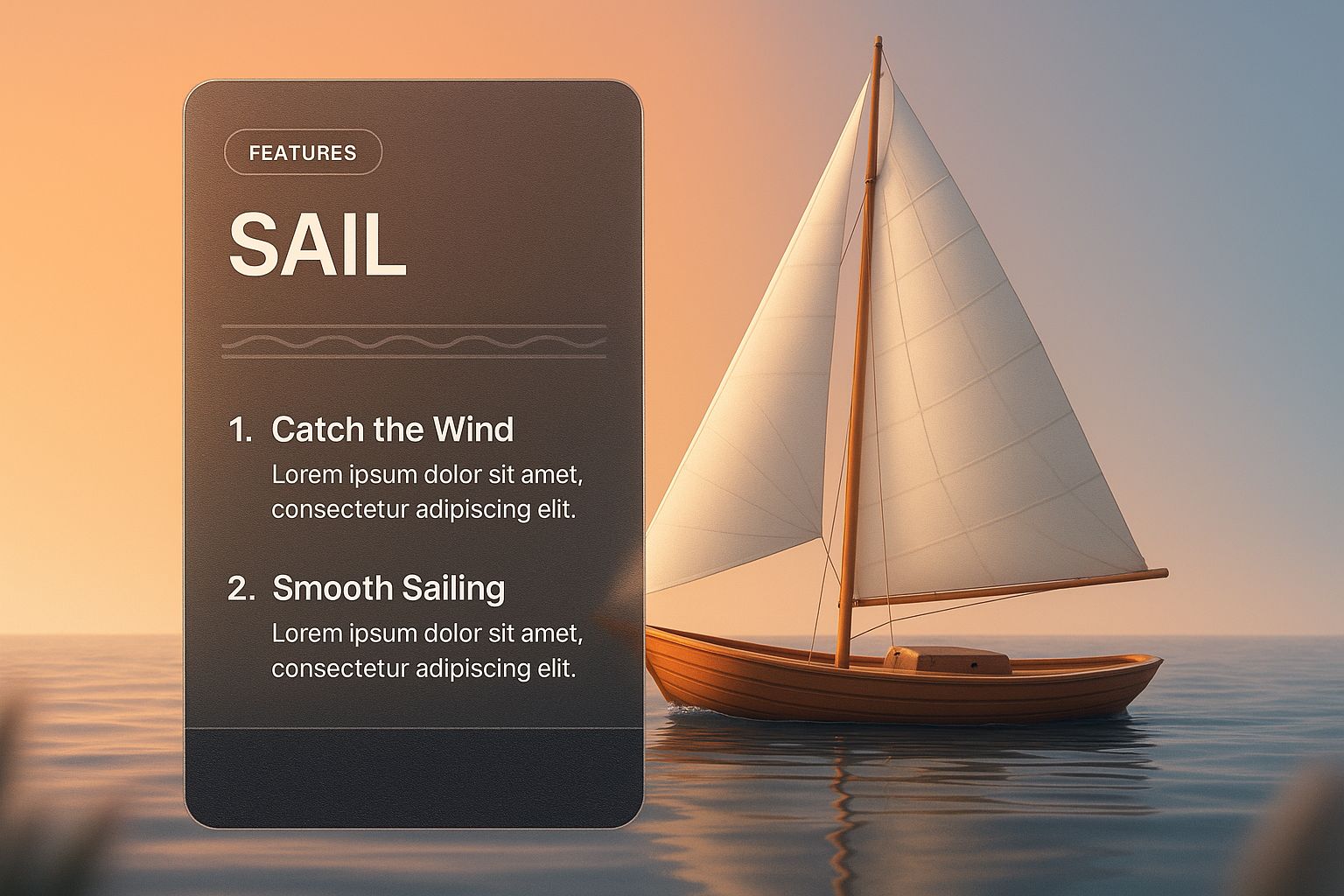 A stunning 3D illustration of a sailboat on calm waters, featuring a dark integrated panel listing key features in a visually appealing layout.