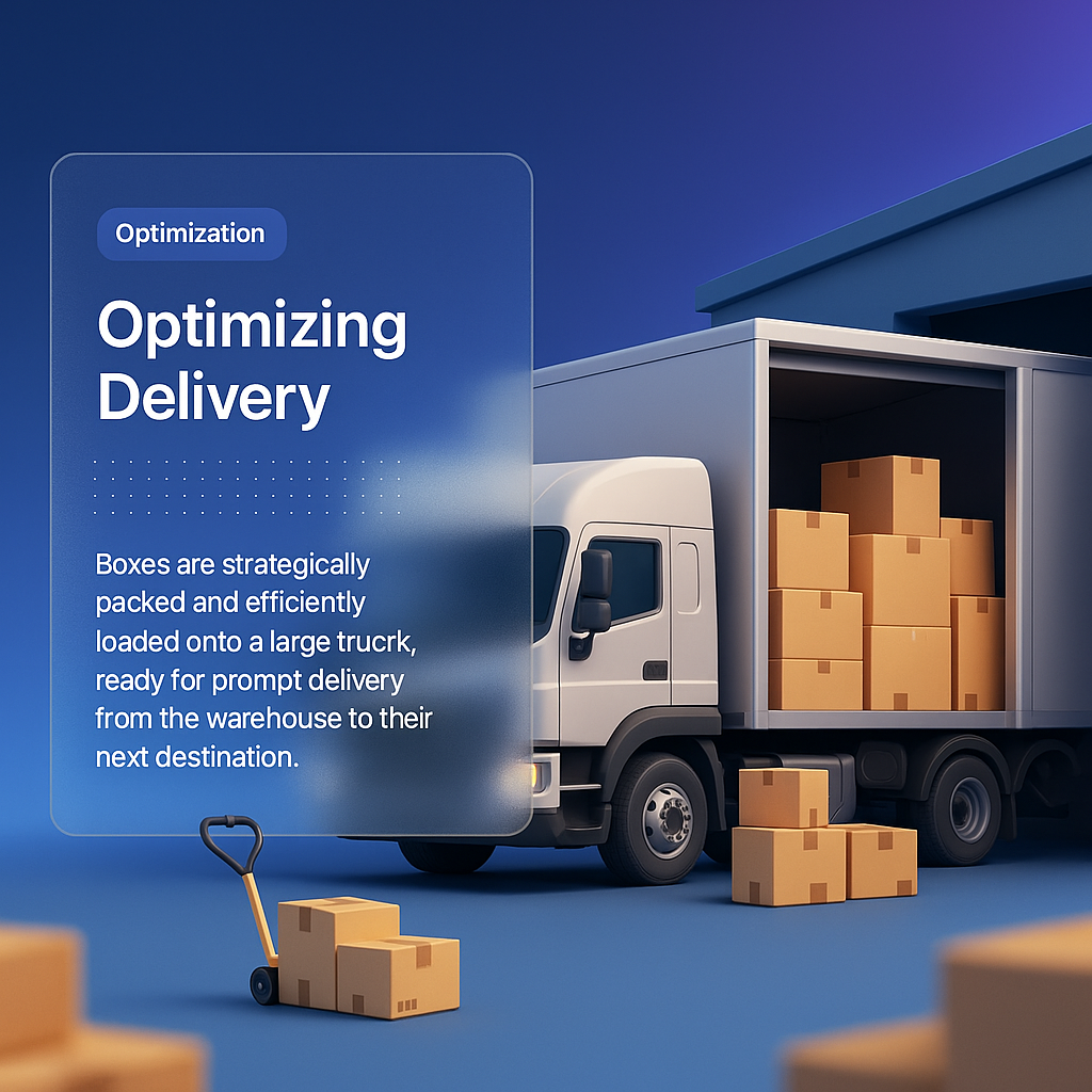 A large truck is parked outside a warehouse, loaded with neatly packed boxes. The scene illustrates efficient delivery preparation with a modern design.