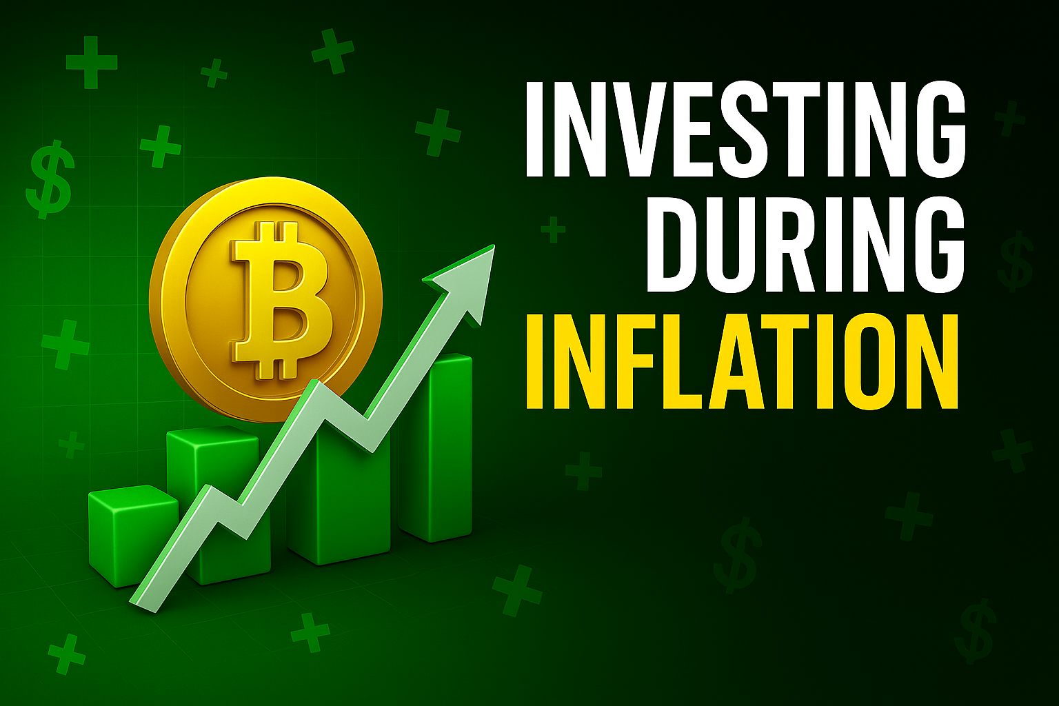 /Collection: , /by davooda/Type: PNG/Dynamic digital graphic illustrating the concept of investing in Bitcoin during inflation, featuring a rising graph and a gold Bitcoin symbol, ideal for finance-related content.