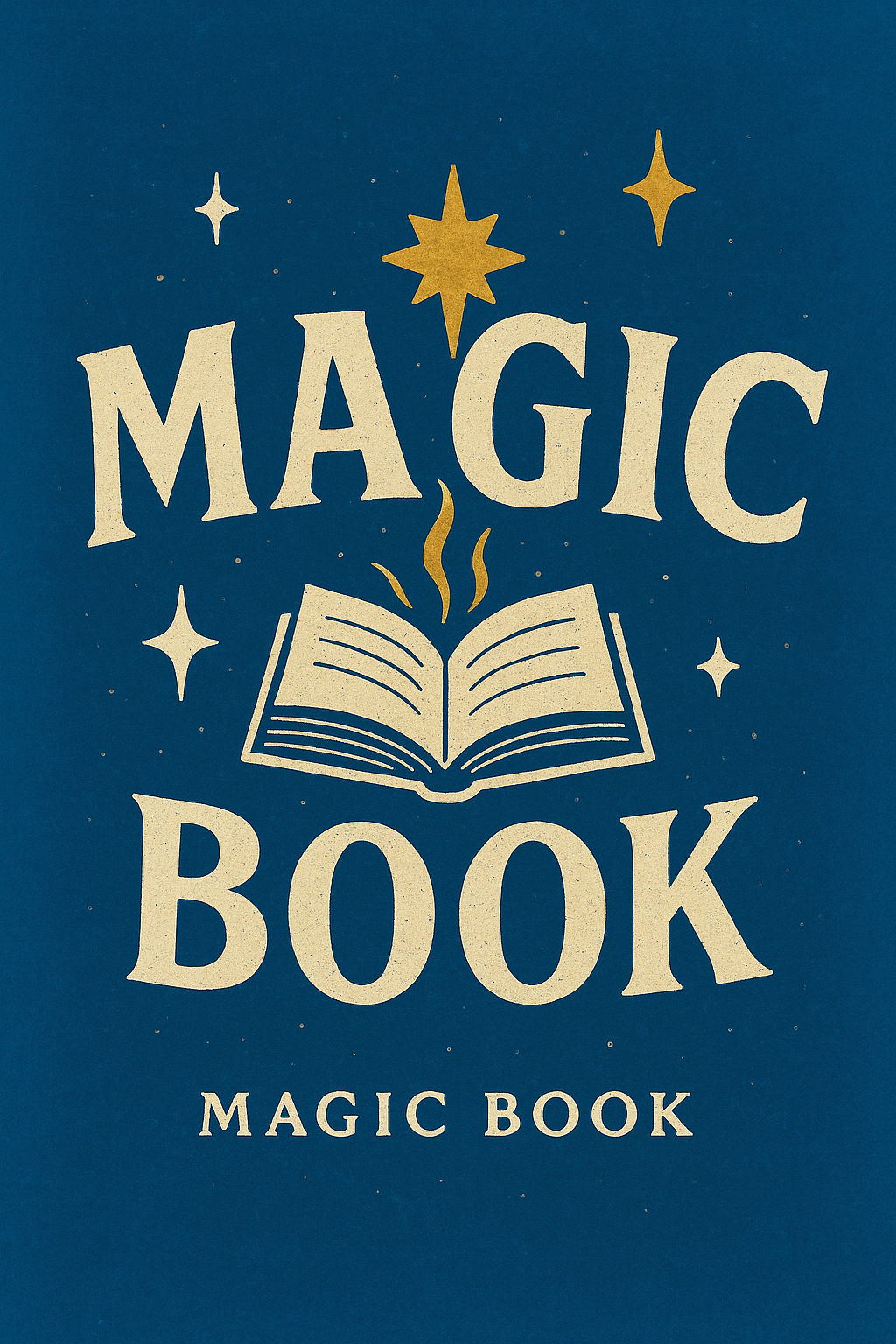 A charming graphic featuring an illustrated open book with a magical theme, adorned with stars and a rich blue background, ideal for fantasy-themed projects.