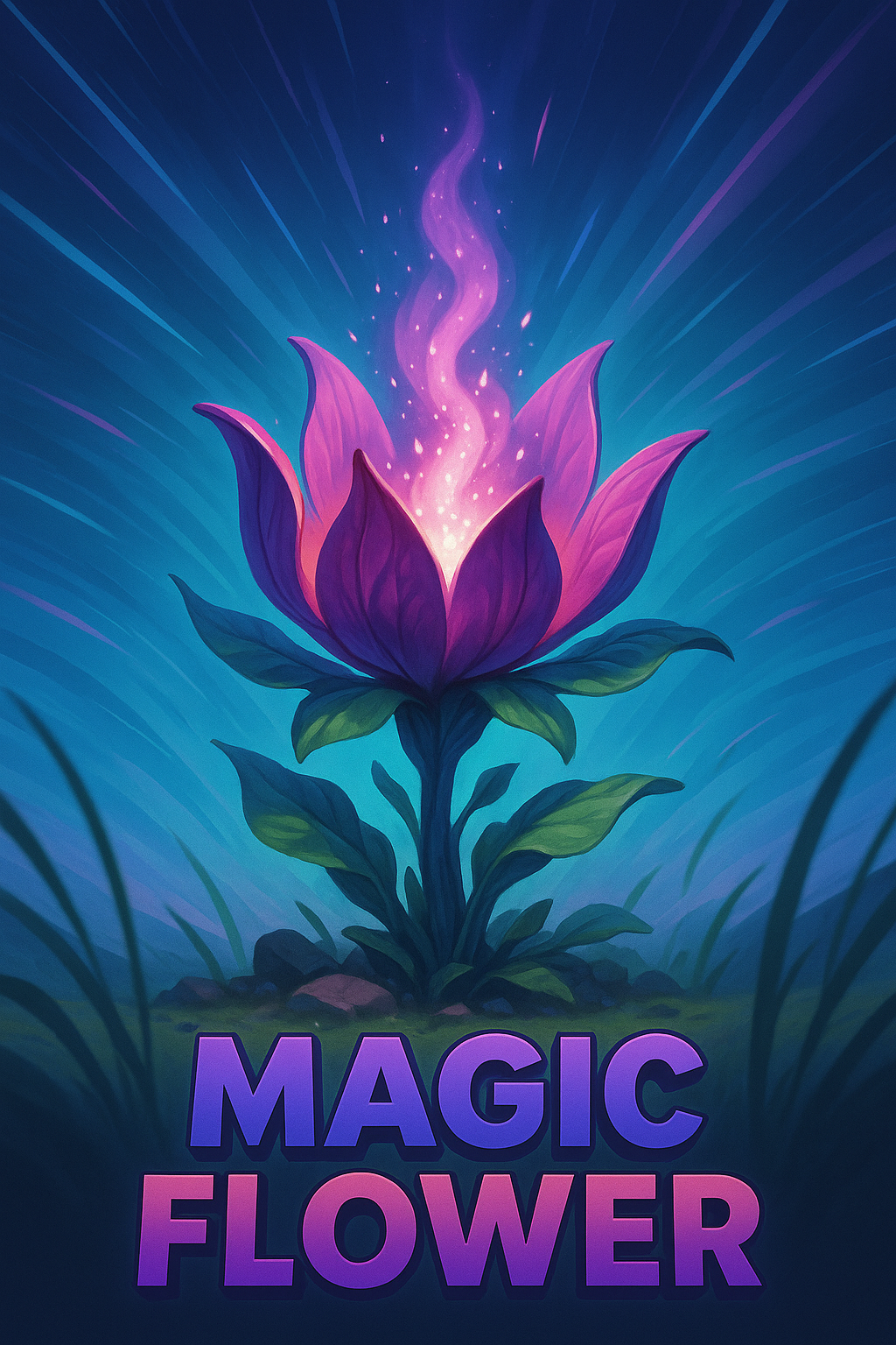A vibrant illustration of a magic flower with dynamic rays emanating from its center. The gradient background enhances the vivid colors of the flower, creating an engaging visual experience.