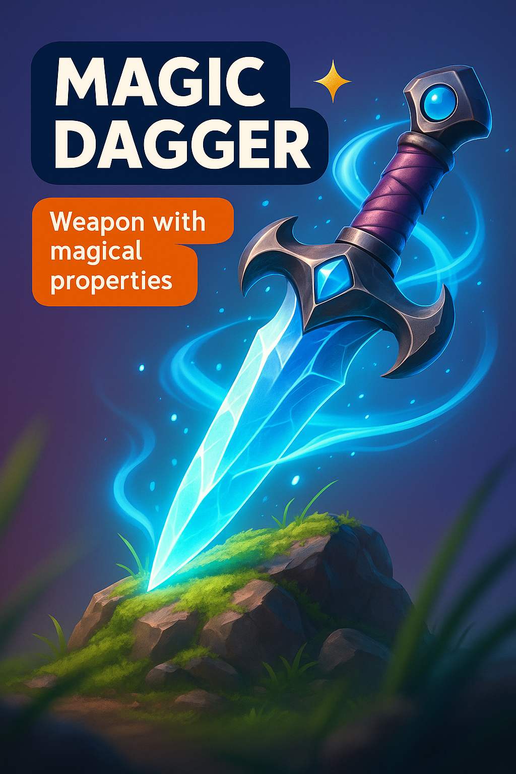 A visually striking illustration of a magic dagger, glowing with mystical properties. The dagger is prominently displayed against a smooth gradient background, enhancing its magical allure.