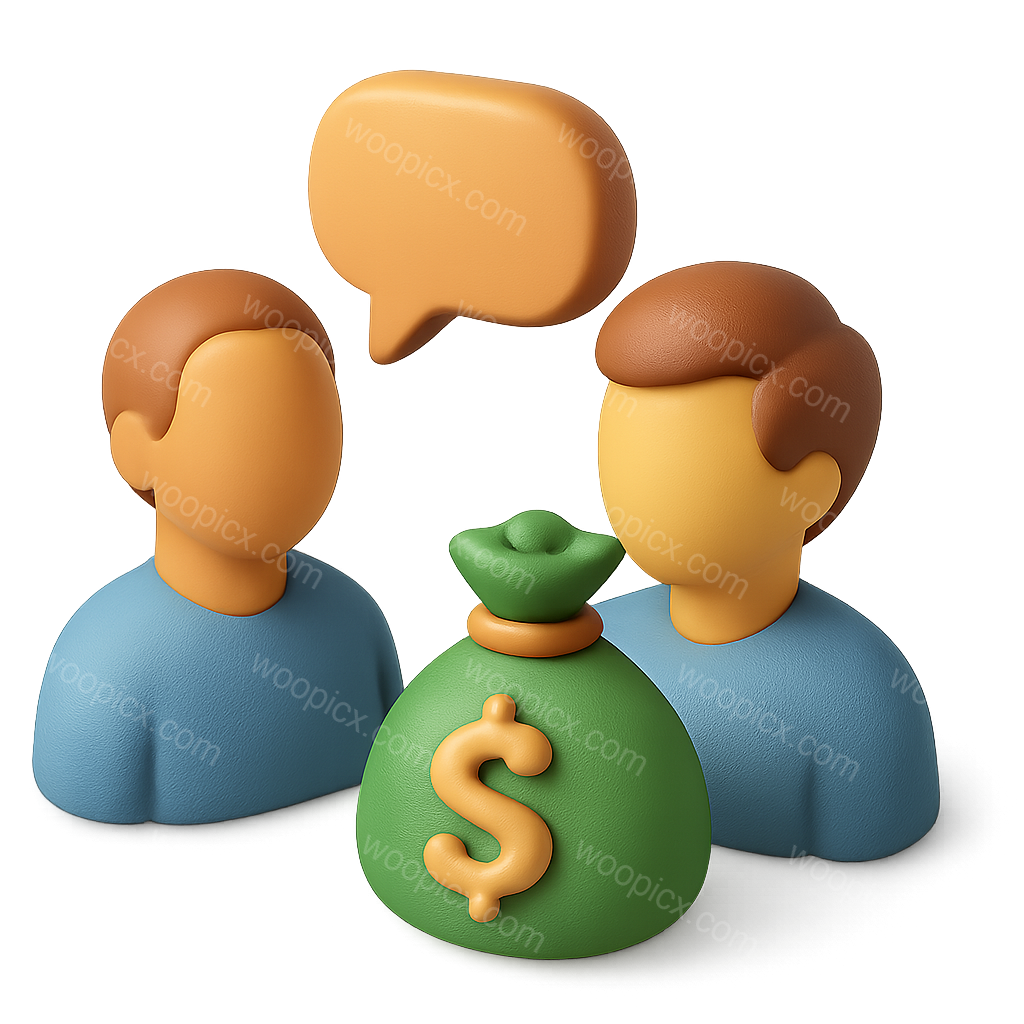 /Premium/Collection: /by davooda/Type: PNG/A vibrant 3D icon depicting two stylized figures in conversation, centered around a money bag and a speech bubble, conveying themes of financial discussion.
