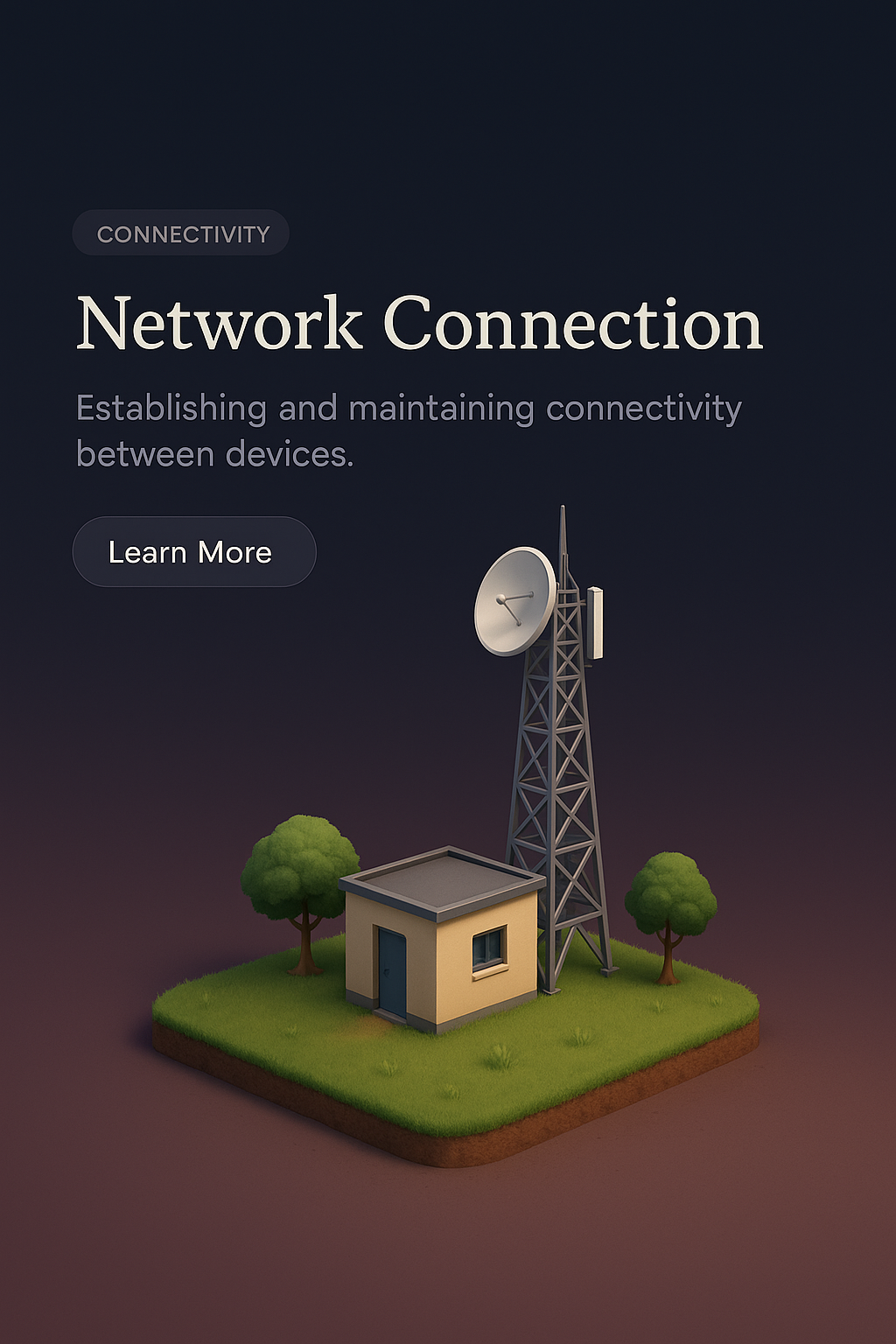 A visually appealing 3D illustration depicting a small network tower and a house surrounded by trees, set against a dark gradient background. The scene emphasizes connectivity.