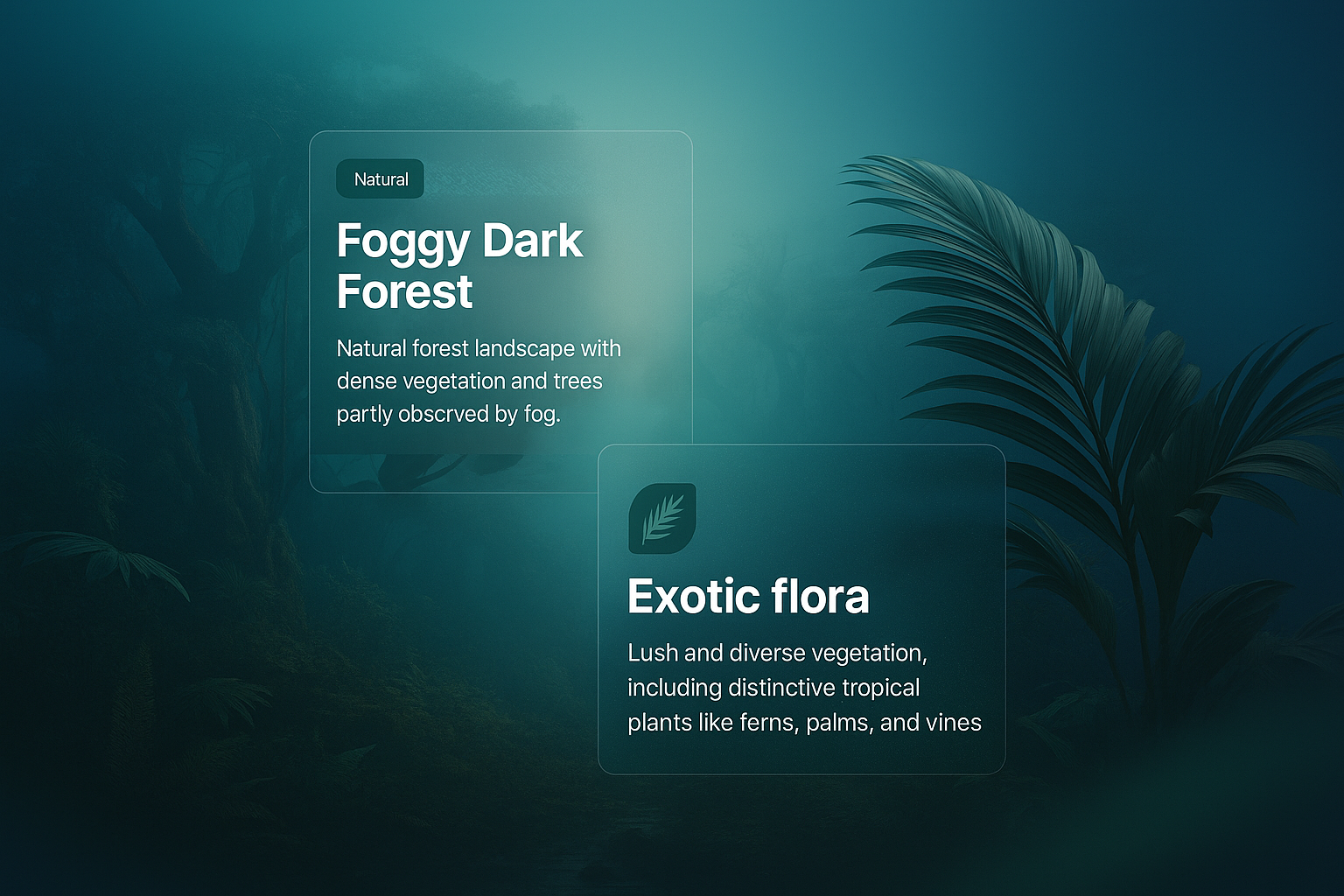 /Collection: /by davooda/Type: PNG/A captivating 3D illustration of a foggy dark forest, featuring dense vegetation and tropical plants. The atmosphere is mystical, with layered visual elements enhancing depth.