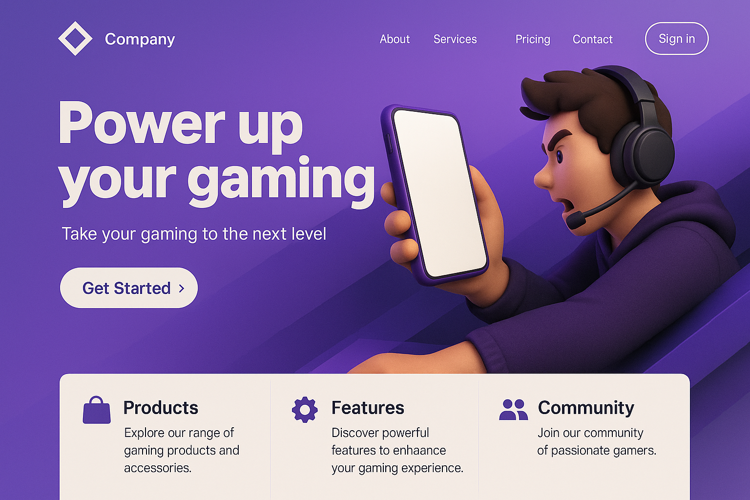 A visually engaging landing page design featuring a gamer holding a purple phone. The layout includes a bold title, clear sections for products, features, and community, along with a dynamic background.