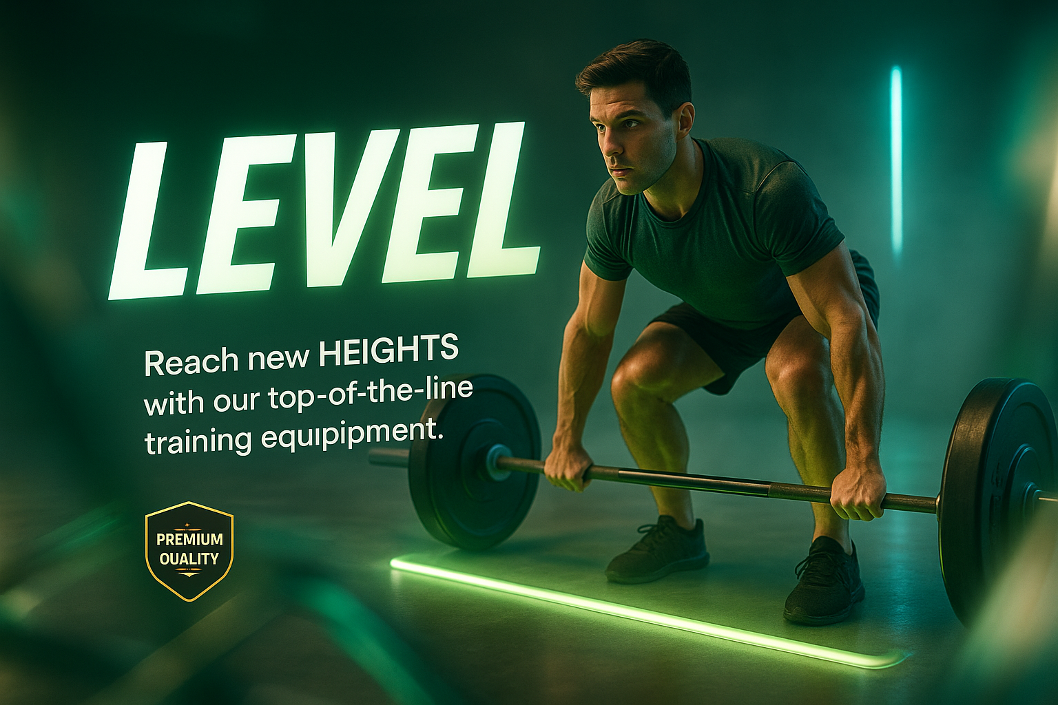 /Collection: /by davooda/Type: PNG/A vibrant carousel slide featuring a man lifting weights in a neon-lit environment. The design emphasizes dynamic angles and layered text elements, promoting top-quality training equipment.