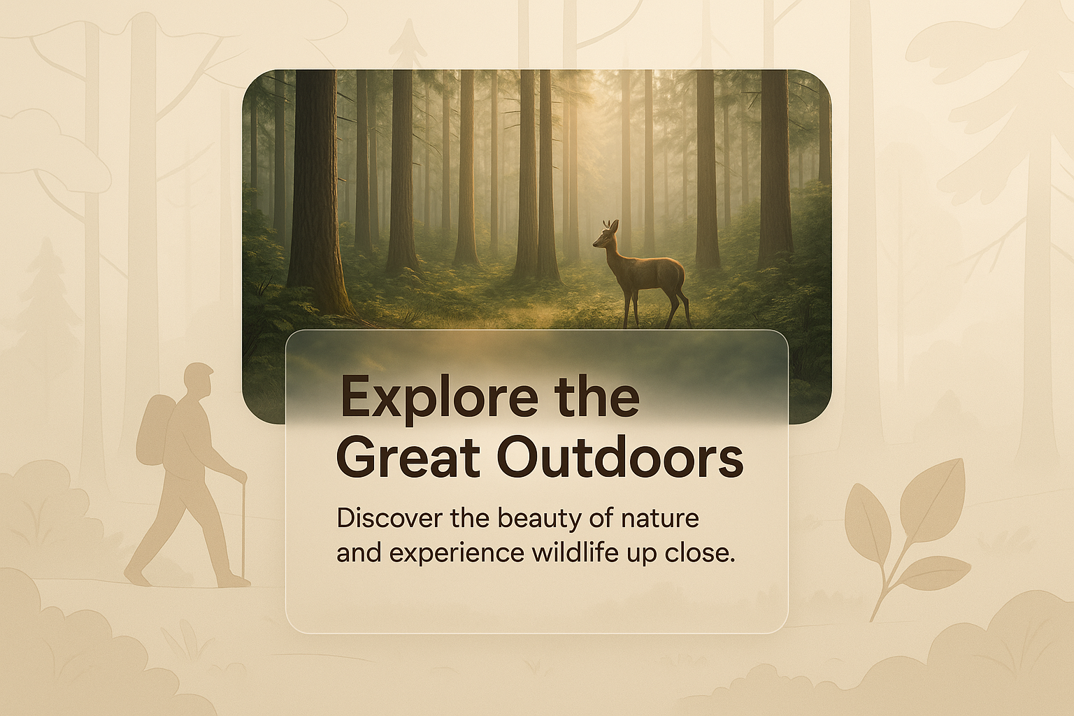 /Collection: /by davooda/Type: PNG/Promotional image encouraging outdoor exploration, featuring a serene forest scene with a deer and a hiker, ideal for nature tourism or wildlife experiences.