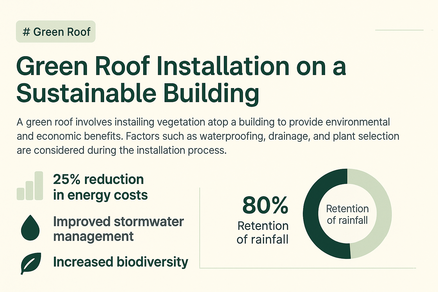 Informative infographic detailing the advantages of green roof installation for sustainable buildings, highlighting energy cost reduction, stormwater management, and biodiversity.