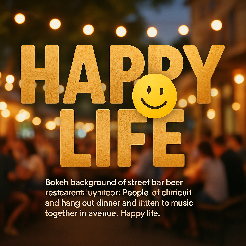 Vibrant graphic featuring a bokeh background of a street bar scene with a cheerful message, ideal for promoting social events or lifestyle content.