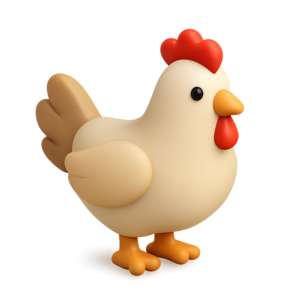 A charming 3D chicken icon presented in a three-quarter view. The design features smooth, rounded shapes and a glossy finish, enhancing its playful appearance.