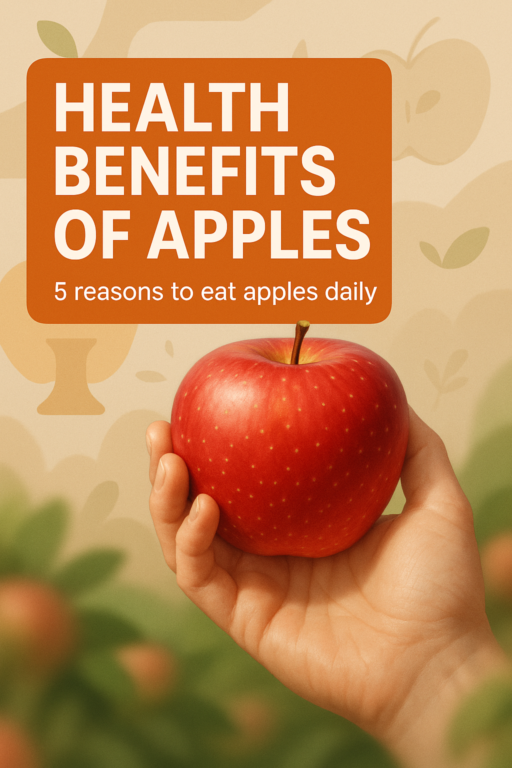 A visually appealing graphic highlighting the health benefits of apples, featuring a hand holding a fresh apple against a soft background, ideal for health-related content.