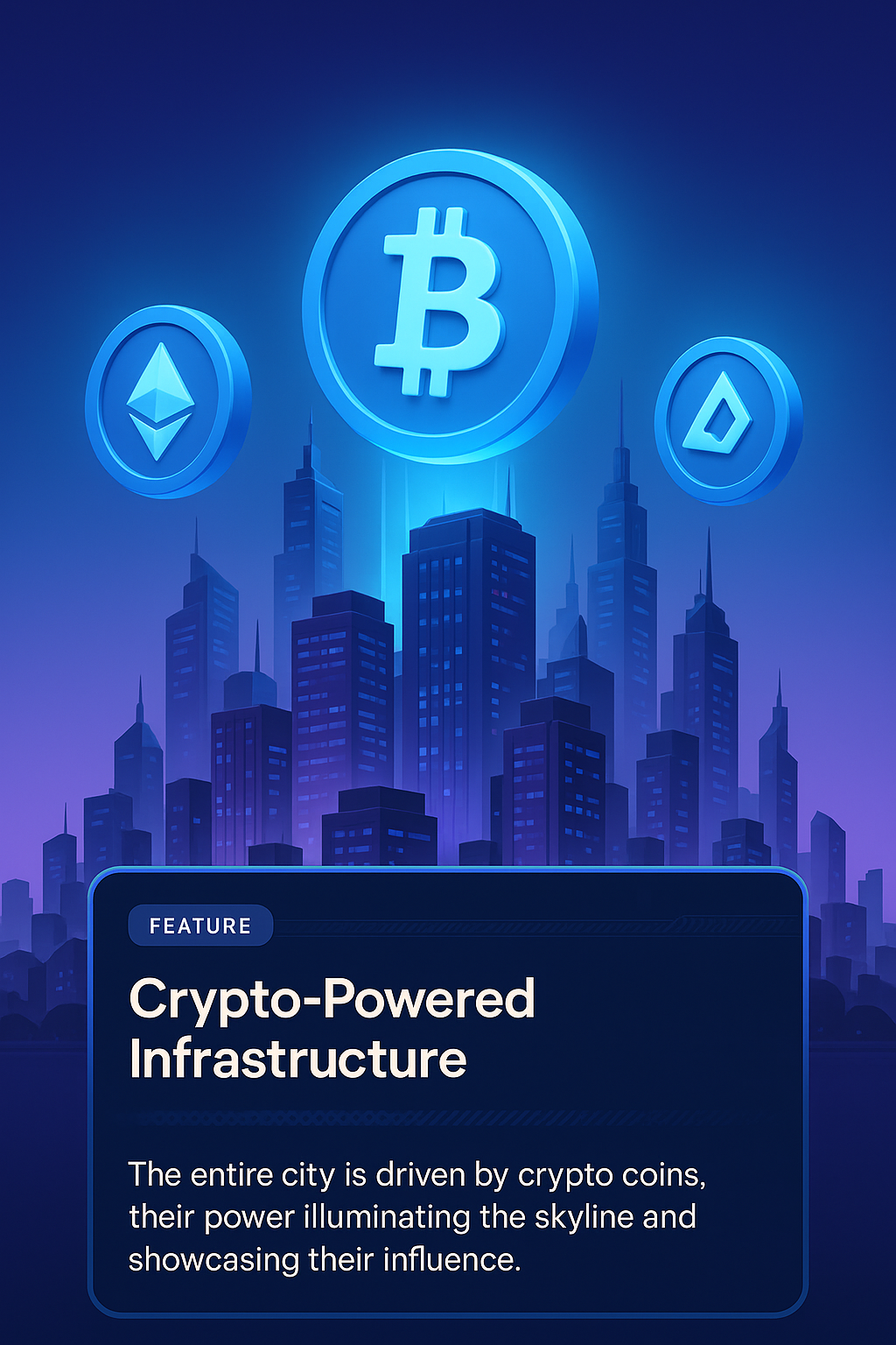 /Collection: /by davooda/Type: PNG/A vibrant futuristic city skyline illuminated by glowing crypto coins. The scene features towering buildings with a gradient backdrop, showcasing the influence of cryptocurrency on urban life.