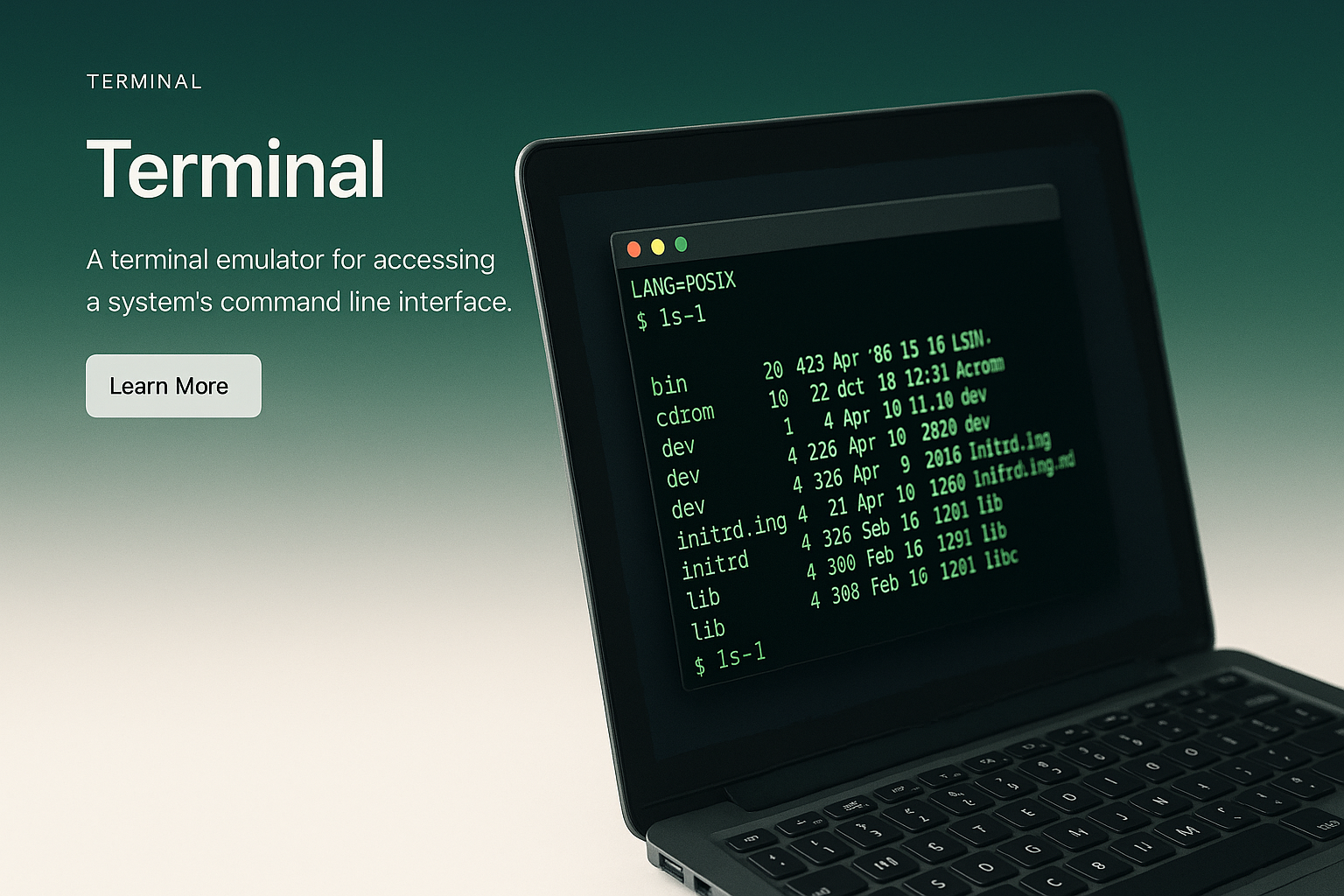 /Collection: /by davooda/Type: PNG/A sleek terminal interface displayed on a laptop screen, featuring a dark green command line with text. The design includes a 'Learn More' button, emphasizing user interaction.