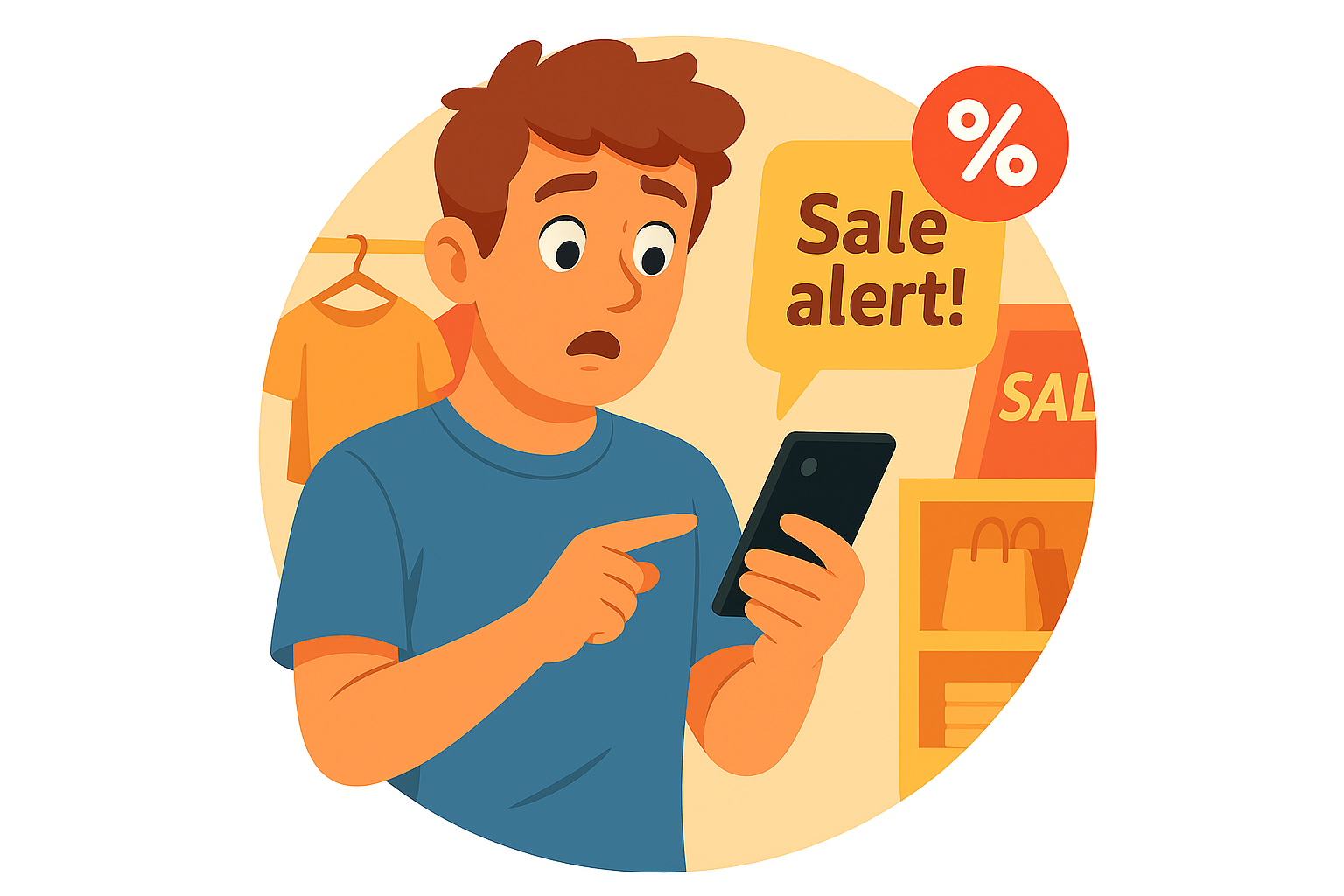 Illustration of a Surprised Shopper Receiving a Sale Alert