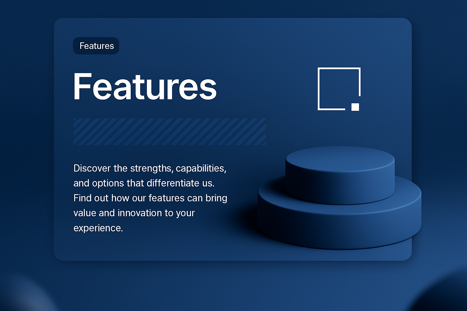 /Collection: /by davooda/Type: PNG/A 3D rendering showcasing a podium with a deep blue gradient background. The design features a prominent text block labeled 'Features', highlighting product strengths and innovations. Subtle blurred elements add depth.