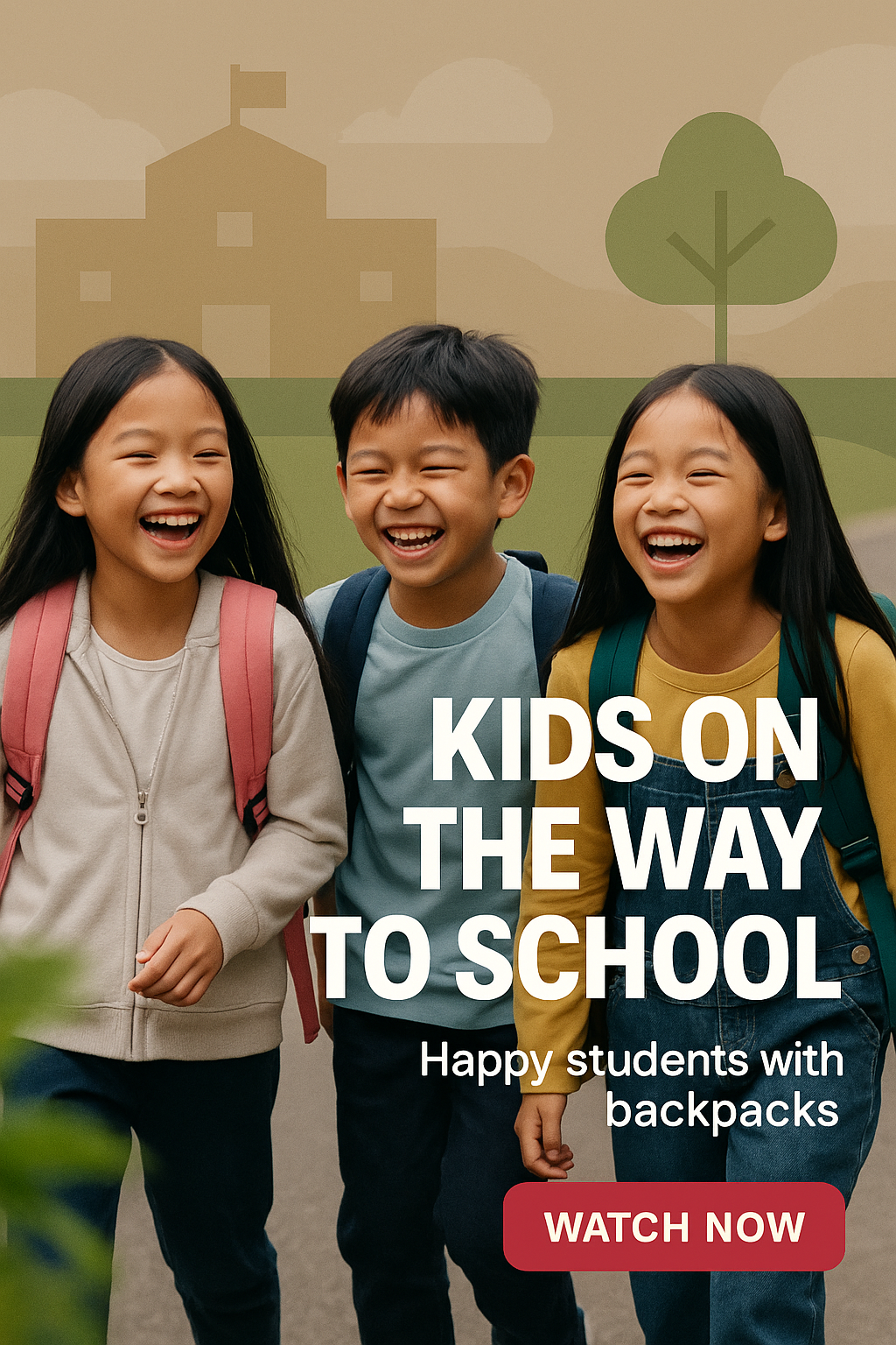 Vibrant social media post showcasing happy children walking to school, conveying a positive and joyful theme. Ideal for educational or promotional content.
