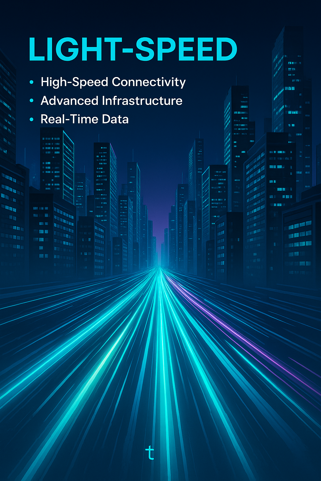 A visually striking digital illustration depicting a futuristic city with light trails symbolizing high-speed connectivity. Ideal for tech-related marketing and presentations.
