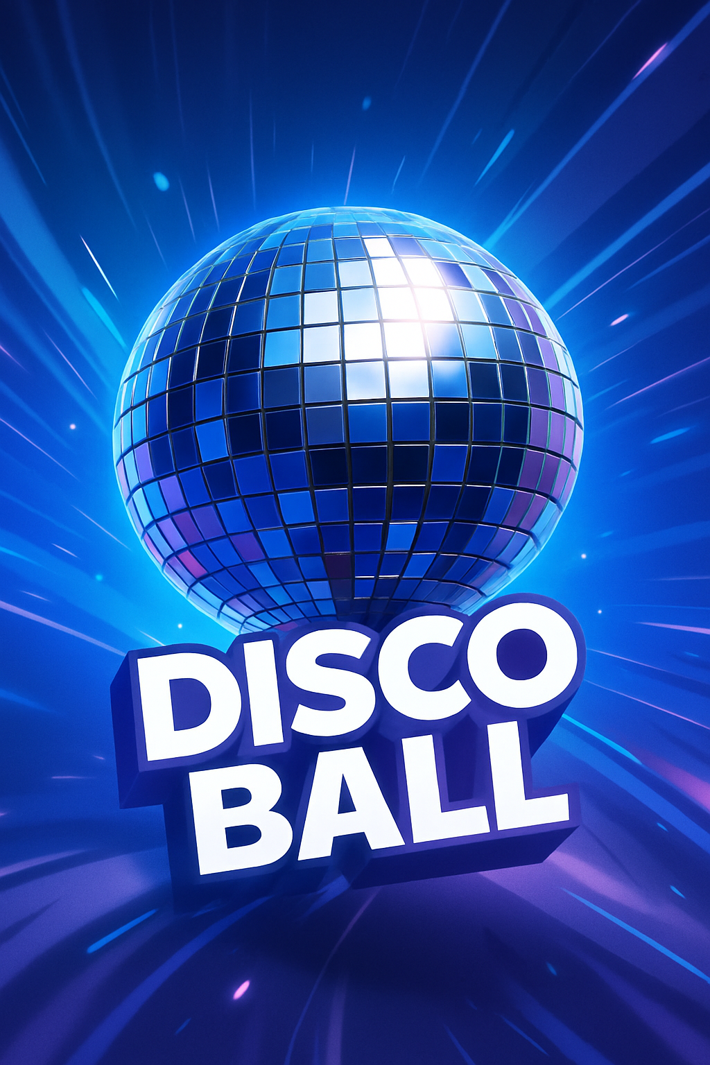 /Collection: /by davooda/Type: PNG/A vibrant illustration of a silver disco mirror ball set against a dynamic blue gradient background, featuring energetic lines radiating outward. The bold title 'DISCO BALL' is prominently displayed in a stylized font, enhancing the lively theme.
