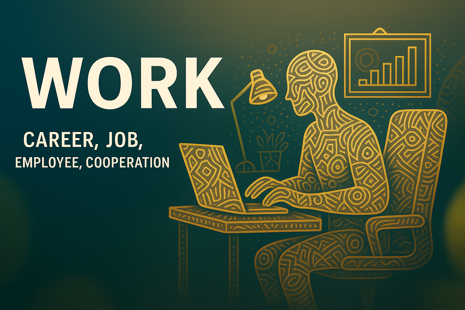 A stylized graphic depicting a figure working on a laptop, symbolizing themes of career and cooperation. Ideal for use in professional or motivational contexts.