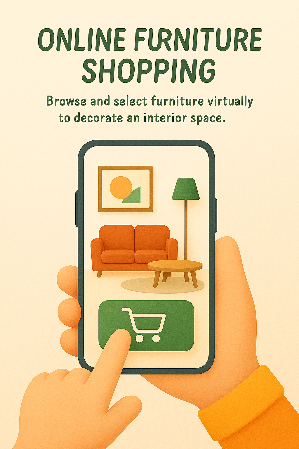 /Collection: /by davooda/Type: PNG/A digital illustration showcasing a hand holding a smartphone displaying a virtual furniture shopping interface. The design emphasizes modern aesthetics and usability, ideal for e-commerce platforms or interior design services.