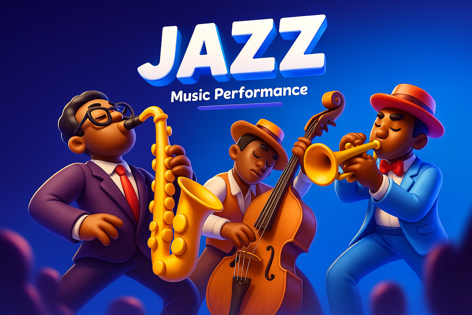 /Collection: /by davooda/Type: PNG/A vibrant 3D illustration depicting three jazz musicians passionately performing. The scene features a saxophonist, a double bassist, and a trumpeter, set against a smooth gradient background. The colors are engaging and dynamic.