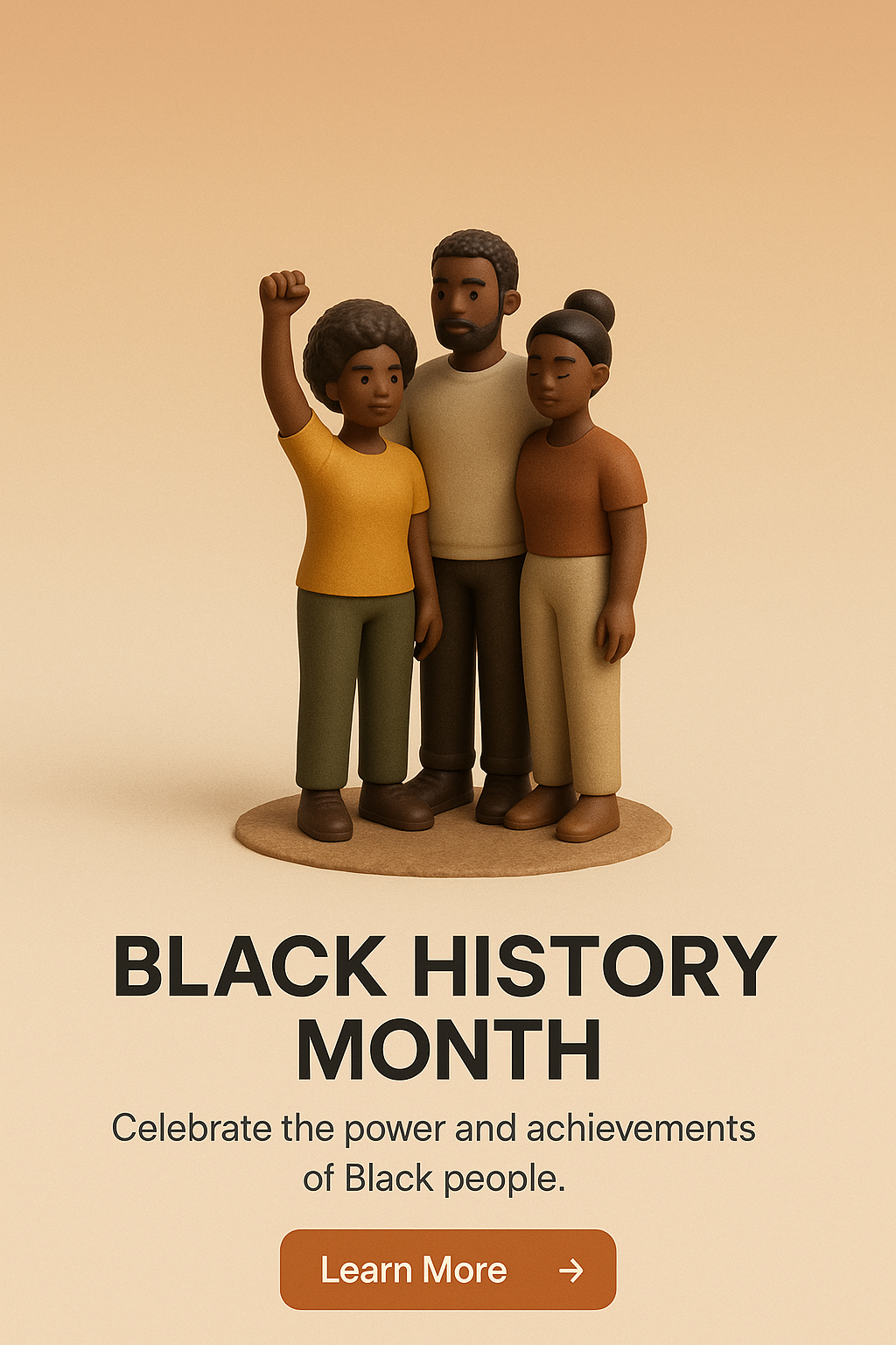 /Collection: /by davooda/Type: PNG/A 3D illustration depicting a small group of Black individuals celebrating their heritage during Black History Month, with a warm gradient background and a call-to-action button.