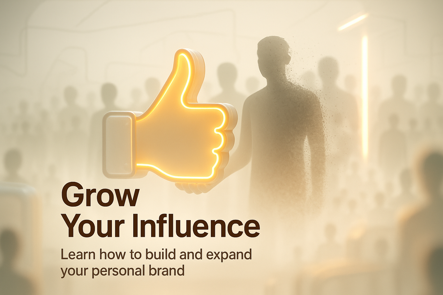 /Collection: /by davooda/Type: PNG/Engaging promotional image focusing on personal brand growth featuring a stylized thumbs-up graphic and silhouettes of people. Ideal for social media and branding workshops.