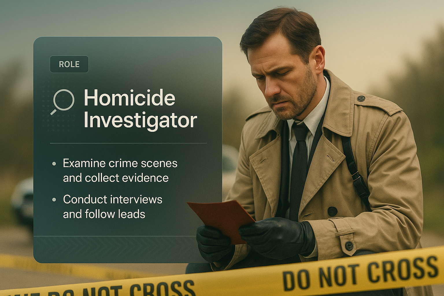 /Collection: /by davooda/Type: PNG/A homicide investigator examines evidence at a crime scene, surrounded by police tape. The design features a light gradient background and an integrated info block with text.