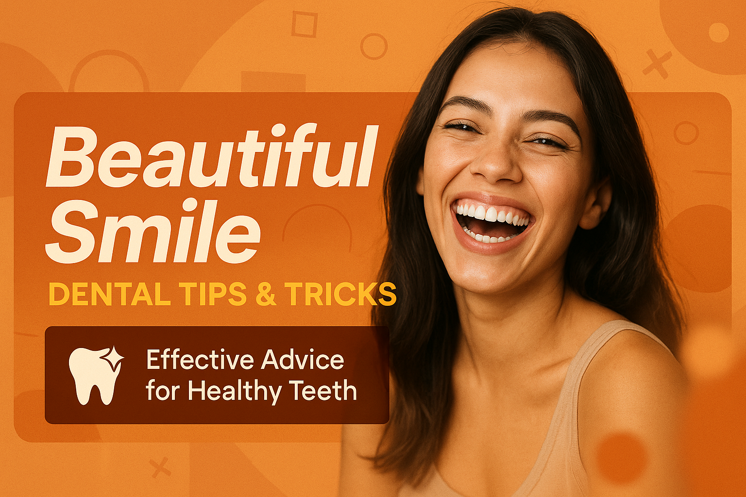 /Collection: /by davooda/Type: PNG/Vibrant social media post featuring a smiling woman, promoting dental tips and tricks. The warm color palette and friendly design make it ideal for health awareness campaigns.
